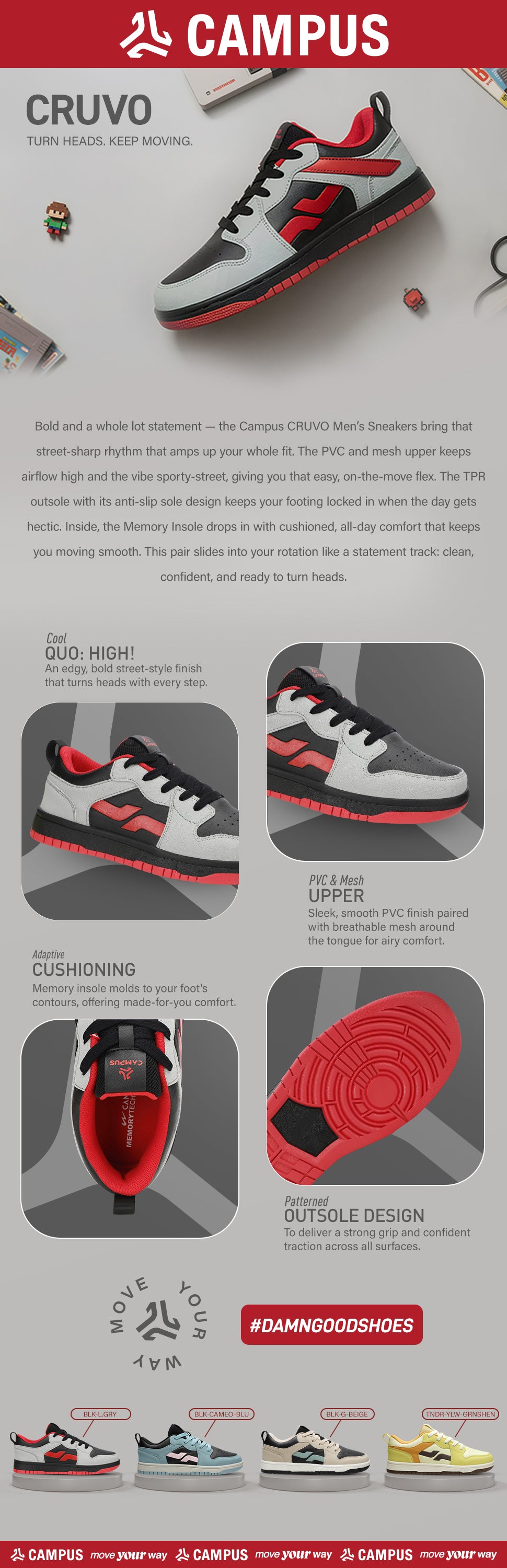 Bold and a whole lot statement — the Campus CRUVO Men’s Sneakers bring that street-sharp rhythm with grey, black, and a striking hit of red that amps up your whole fit. The PVC and mesh upper keeps airflow high and the vibe sporty-street, giving you that easy, on-the-move flex. The TPR outsole with its anti-slip sole design keeps your footing locked in when the day gets hectic. Inside, the Memory Insole drops in with cushioned, all-day comfort that keeps you moving smooth. With its subtle grey base and that loud red pop, this colourway slides into your rotation like a statement track: clean, confident, and ready to turn heads.