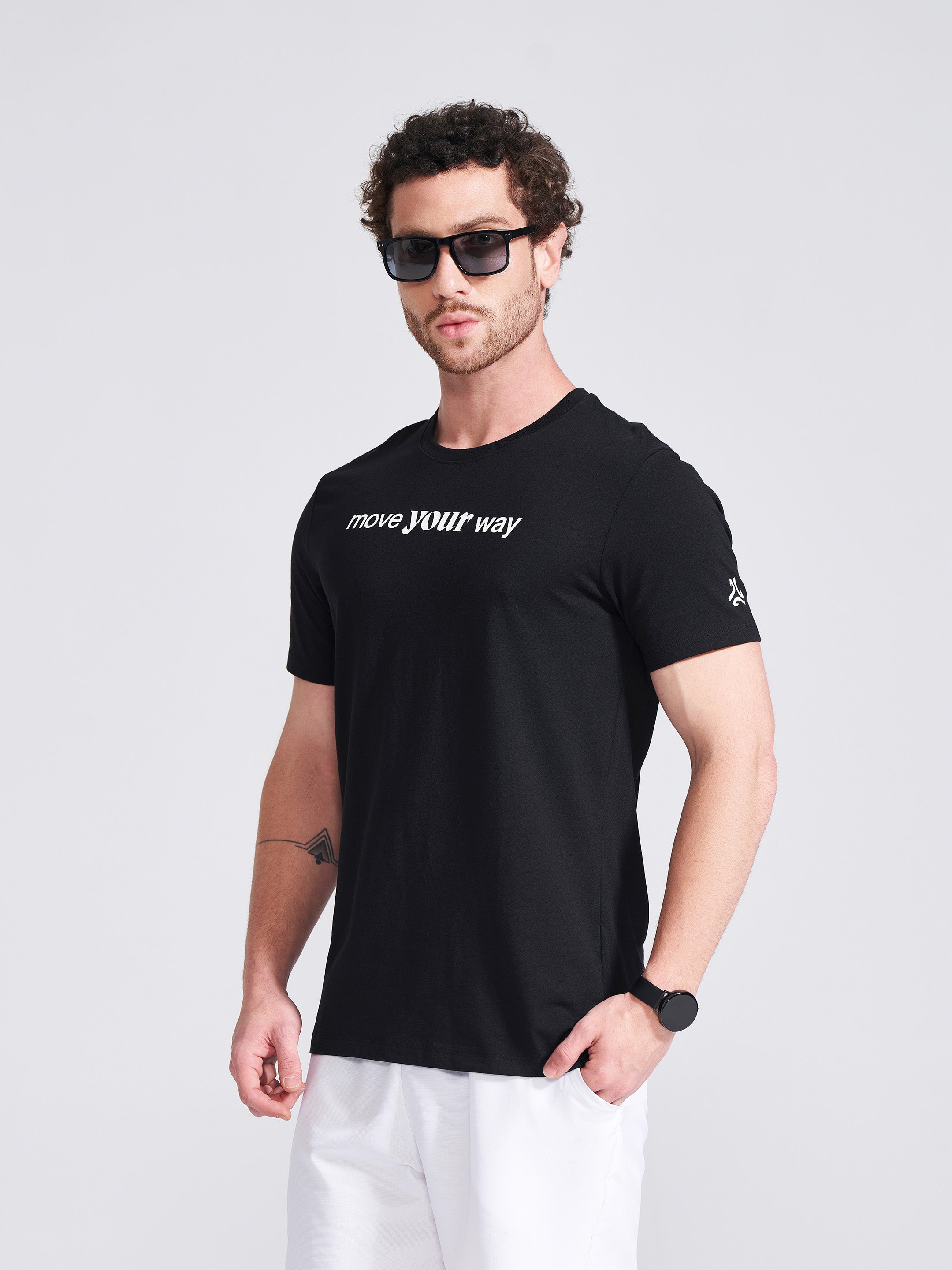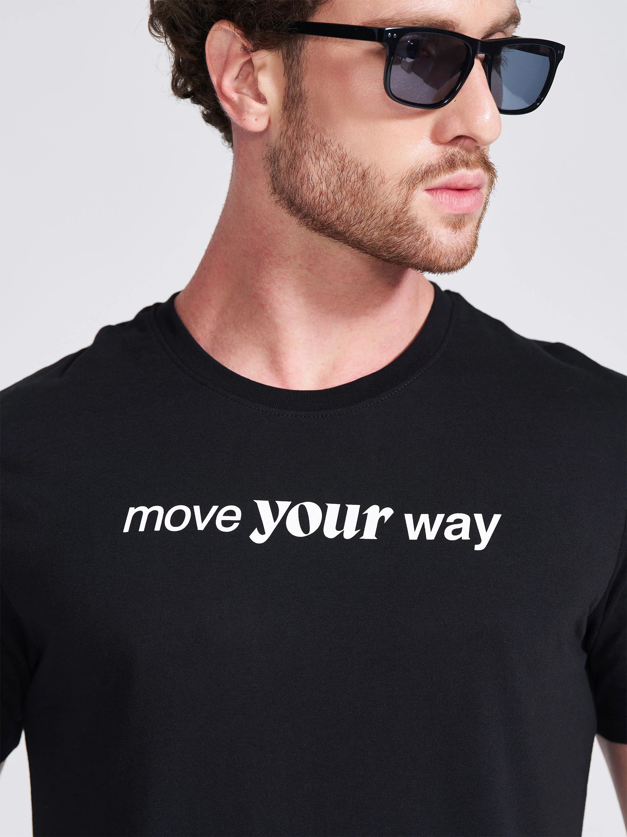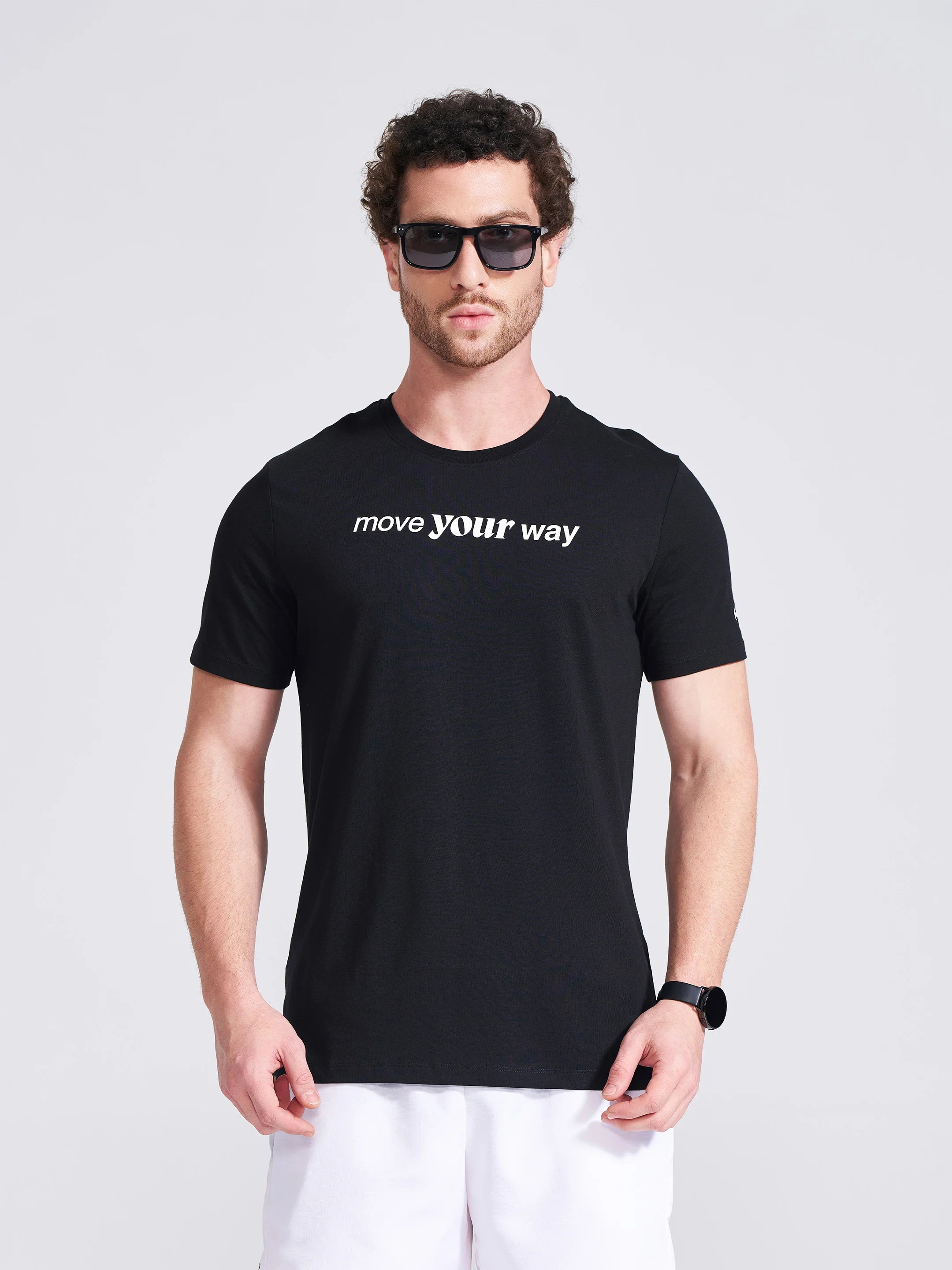 Your trusted everyday black tee, elevated. The Campus Round Neck T-Shirt in black uses an ultra soft-touch cotton–poly jersey that stays light, breathable, and comfortable from morning to night. The smooth knit keeps the fit easy, while the “Move Your Way” print acts as your everyday reminder to keep going confidently and without overthinking it. The classic black colorway makes it endlessly versatile, adding a modern, understated edge that works across moods and outfits.