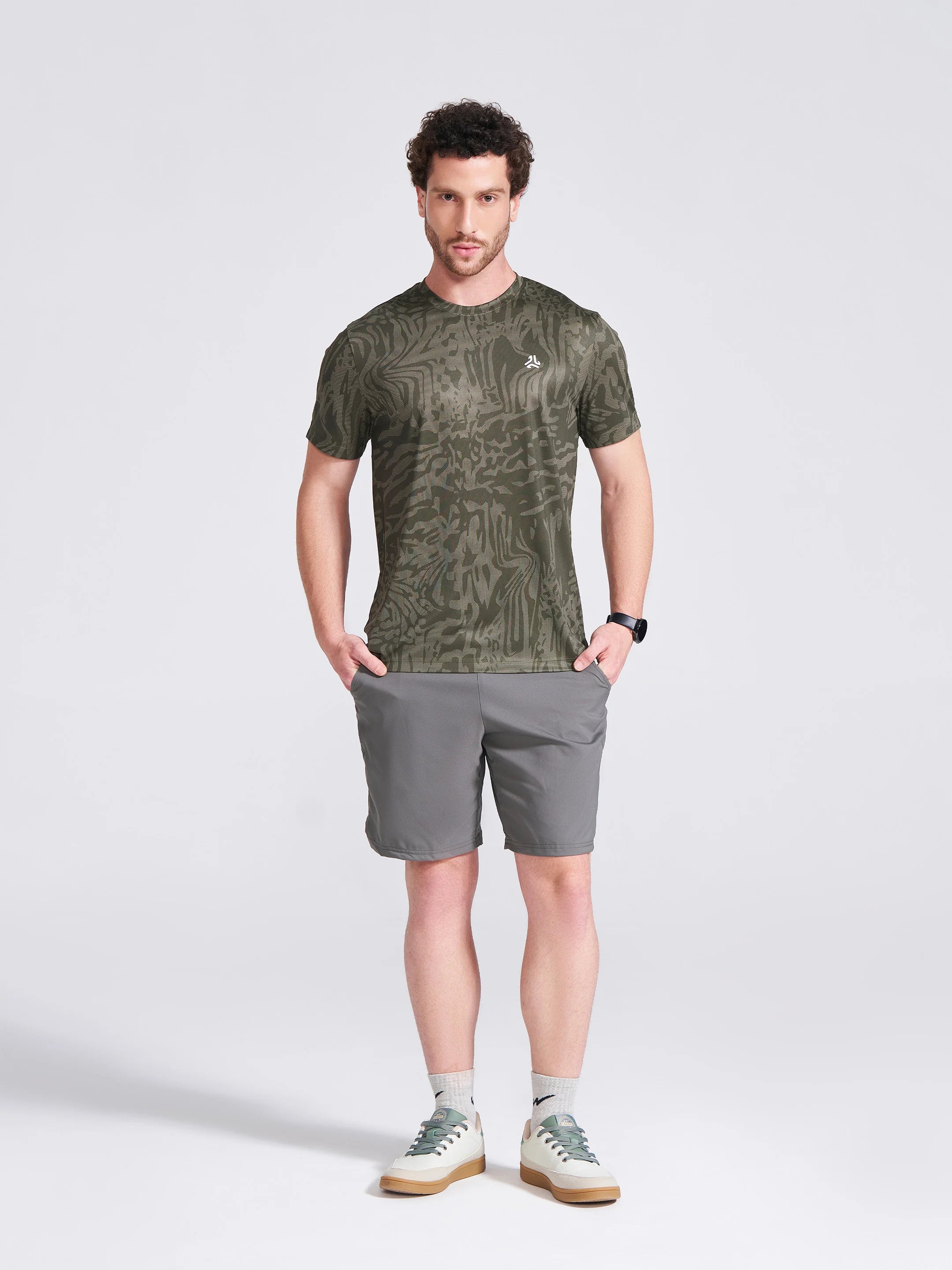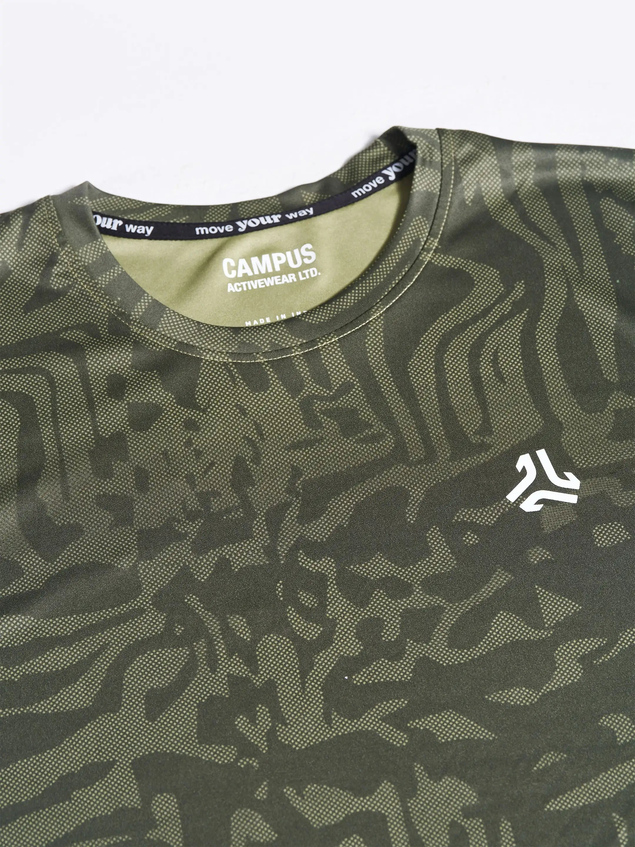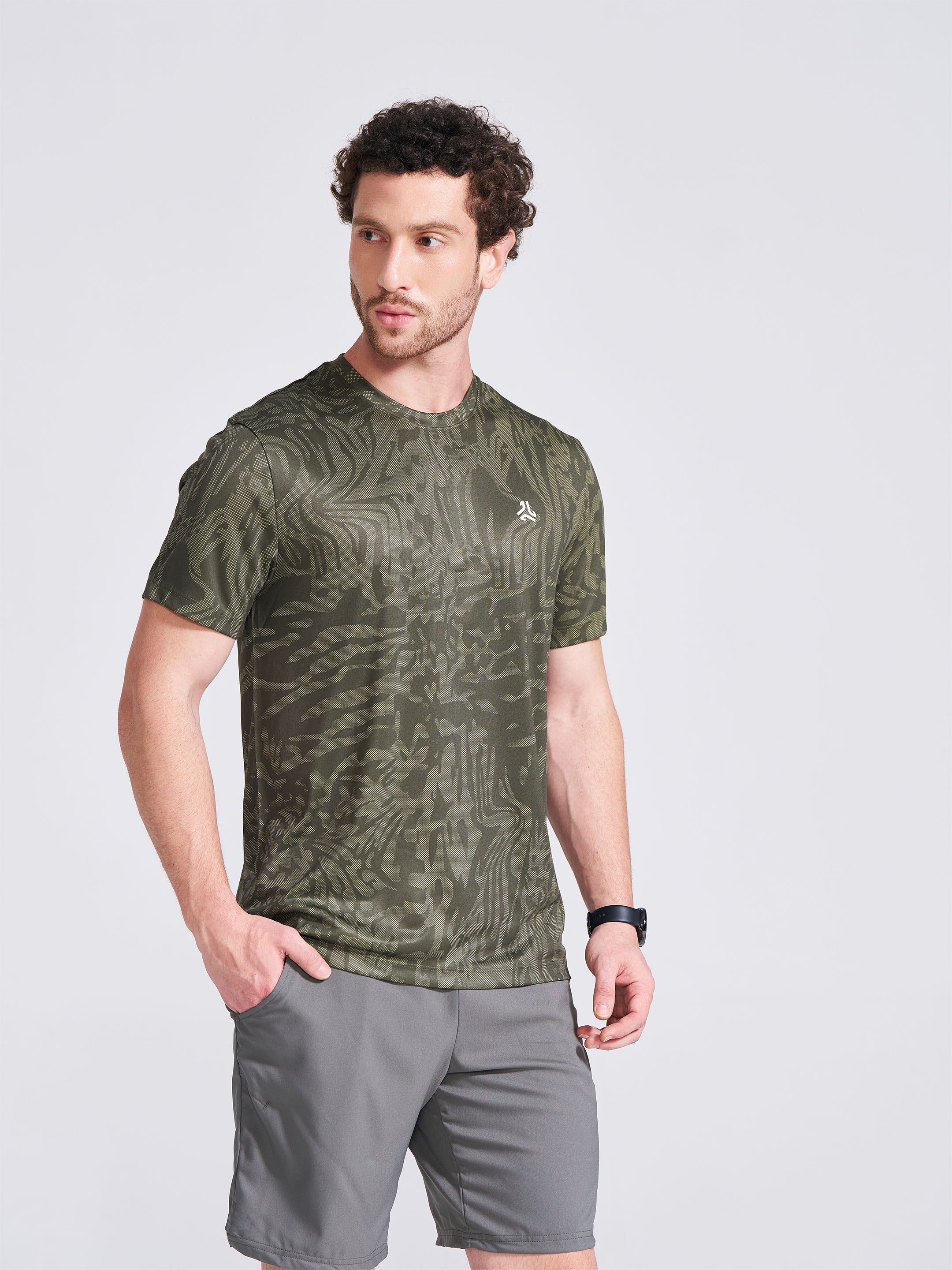 The Campus Round Neck Dry-Fit T-Shirt — a tee that keeps up with every move, every stretch, every pace. Crafted from smooth knitted polyester, it offers natural, easy stretch and a lightweight, breezy feel. As things heat up at the gym, the quick-dry material steps in to handle the sweat, while anti-microbial and anti-odor properties help you stay comfy and confident through long sweat sessions. The understated print and reflective strip add a sharp touch that feels modern without being loud, while the olive shade brings an outdoorsy vibe that fits right into gym sessions, evening runs, or casual sporty days.