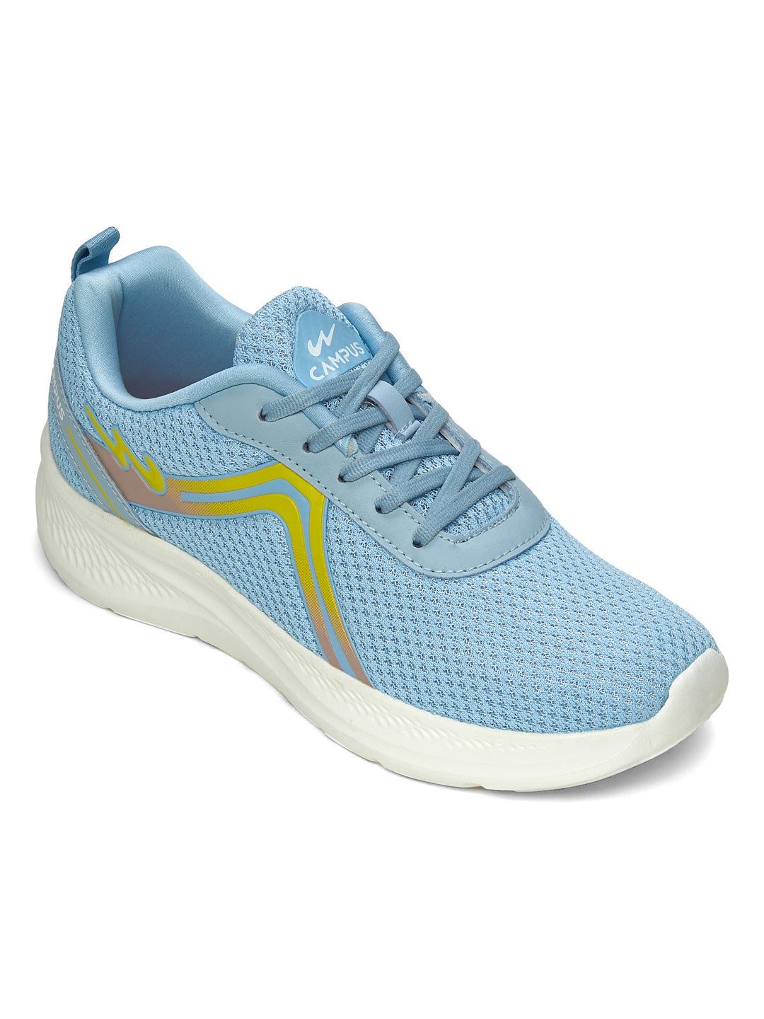 Shine bright with Raye Women's Running Shoes from Campus. Designed with a breathable mesh upper, these shoes keep your feet cool and comfortable all day. The secure lace-up closure ensures a snug fit, while the Memory Insole provides custom cushioning for every step. The Pillofoam Outsole offers excellent impact cushioning, making these shoes perfect for the gym, track, or any daily activity. With a vibrant color combination of light sky blue and lemon yellow, Raye women's shoes are here to make your everyday a lot more trendy!