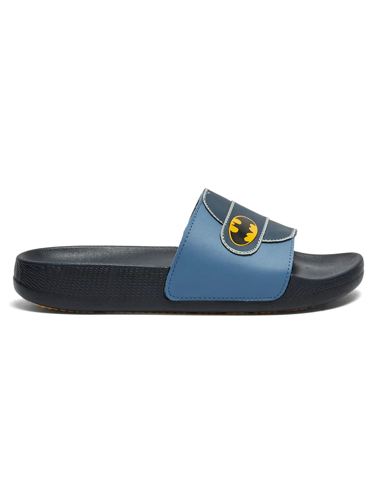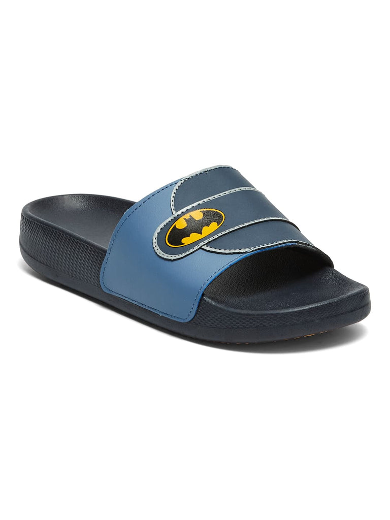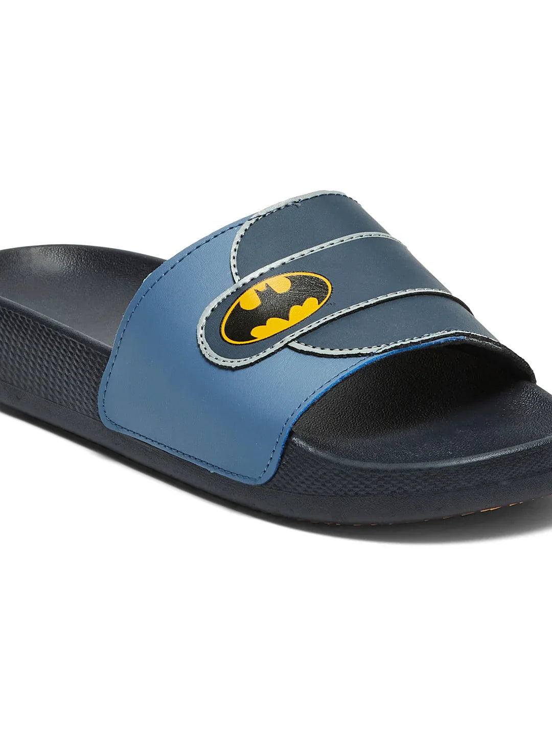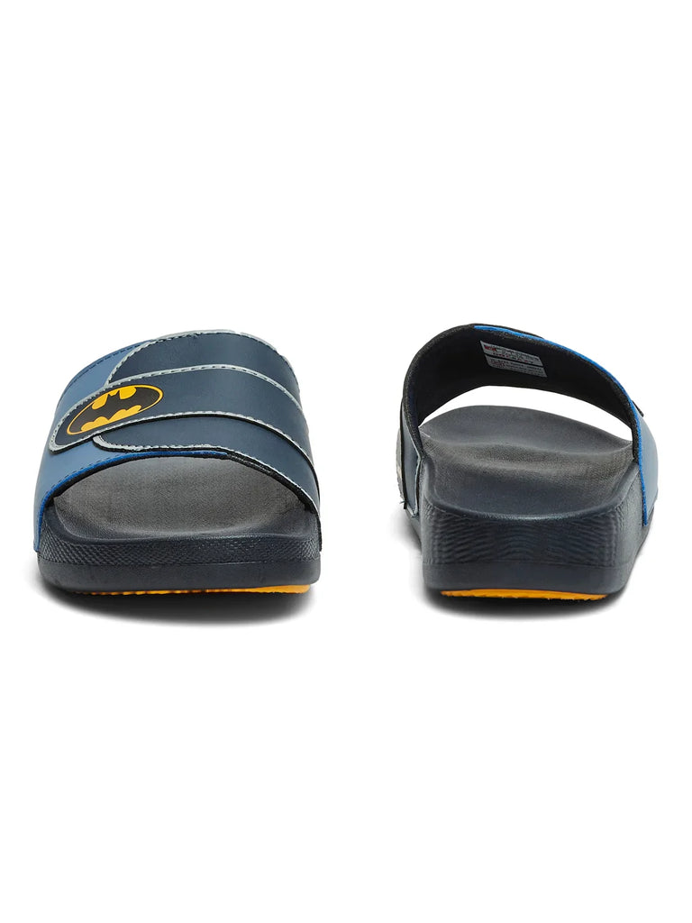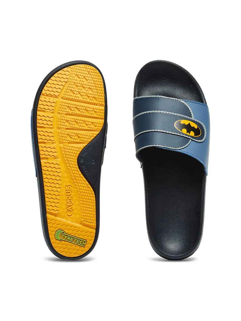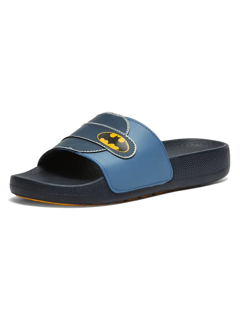 Ready to slide into superhero-level chill? Meet the Campus SL-462 Men's Sliders in navy and slate. Featuring the iconic Batman logo boldly displayed on a soft PU strap, these sliders bring fearless energy to every step. Designed with an anti-skid EVA & rubber sole, they offer steady grip and cushioned comfort, making them the perfect easy-wear companion—whether you're lounging, strolling, or making quick moves!