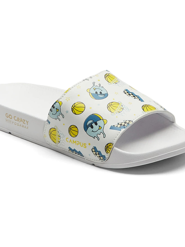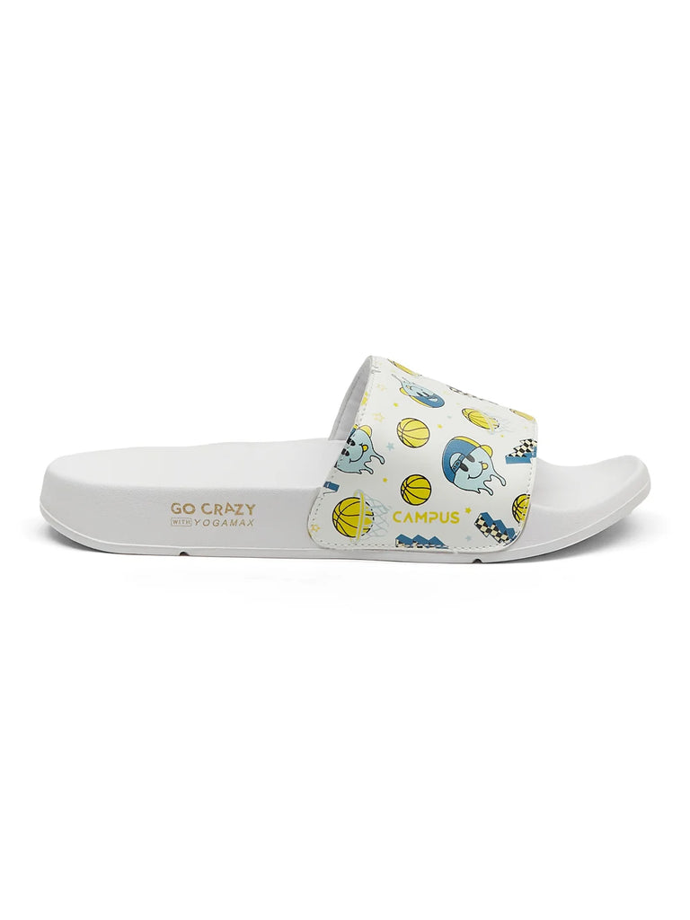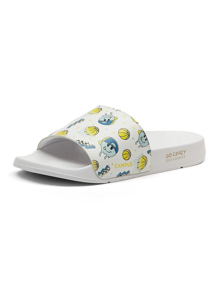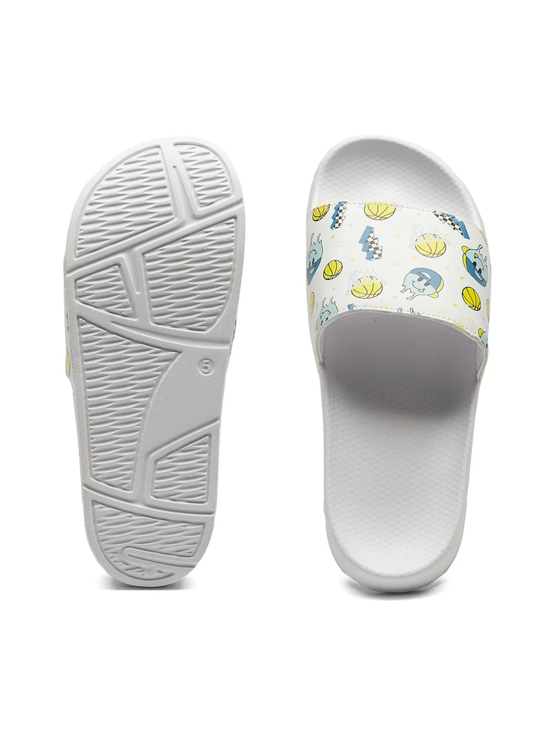 Pop goes the summer! The SL-470C Child's Sliders in White, Lemon yellow & Teal Blue is your dose of sunshine and smiles. The PU printed strap adds visual punch, while the Pillofoam-cushioned EVA sole keeps you easy-breezy from morning chai to moonlight terrace hangs.