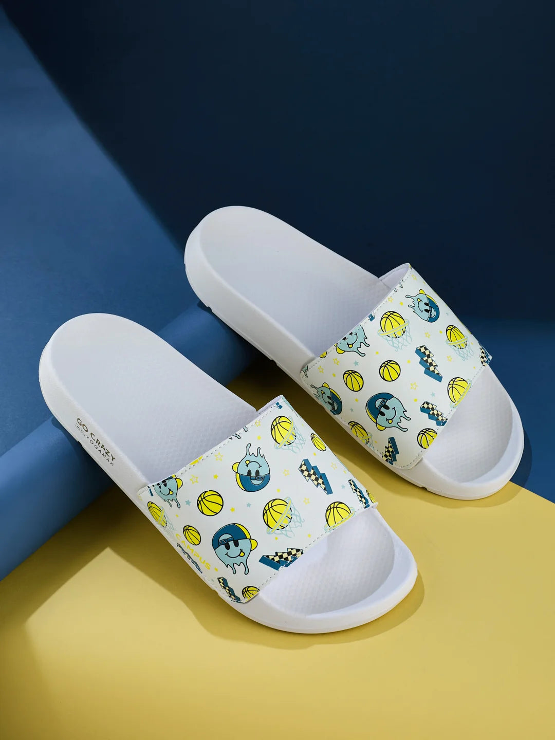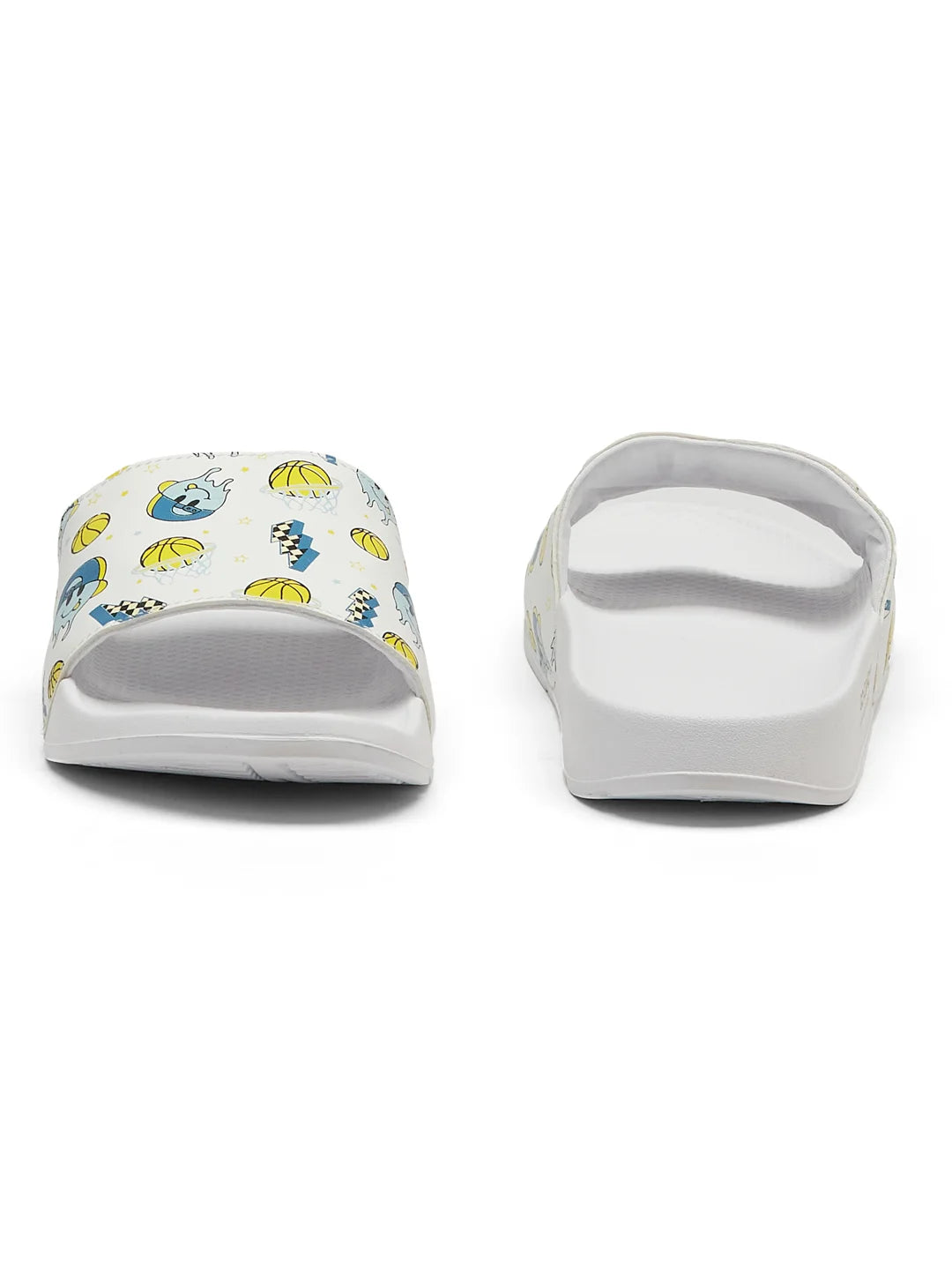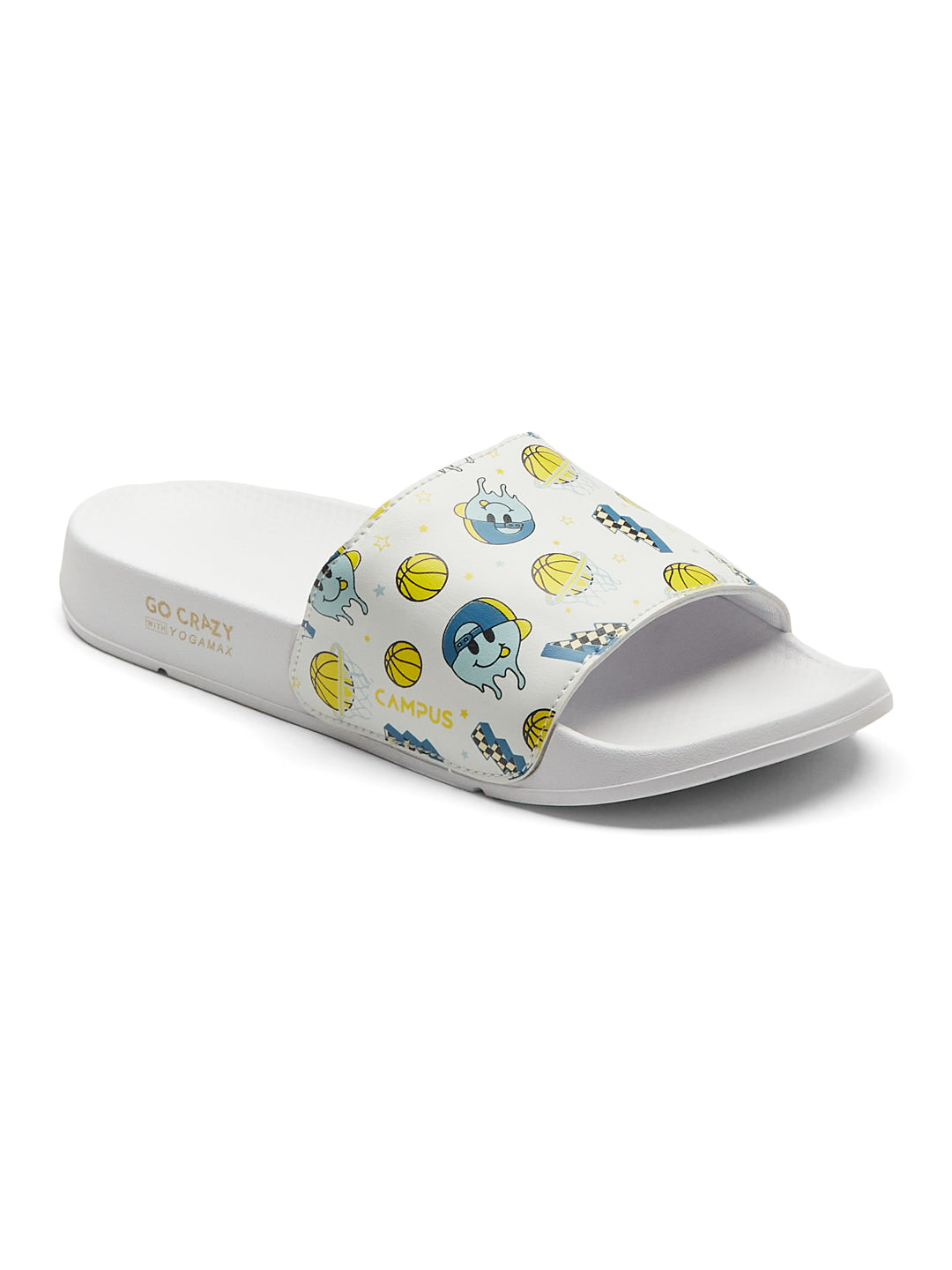 Pop goes the summer! The SL-470C Child's Sliders in White, Lemon yellow & Teal Blue is your dose of sunshine and smiles. The PU printed strap adds visual punch, while the Pillofoam-cushioned EVA sole keeps you easy-breezy from morning chai to moonlight terrace hangs.