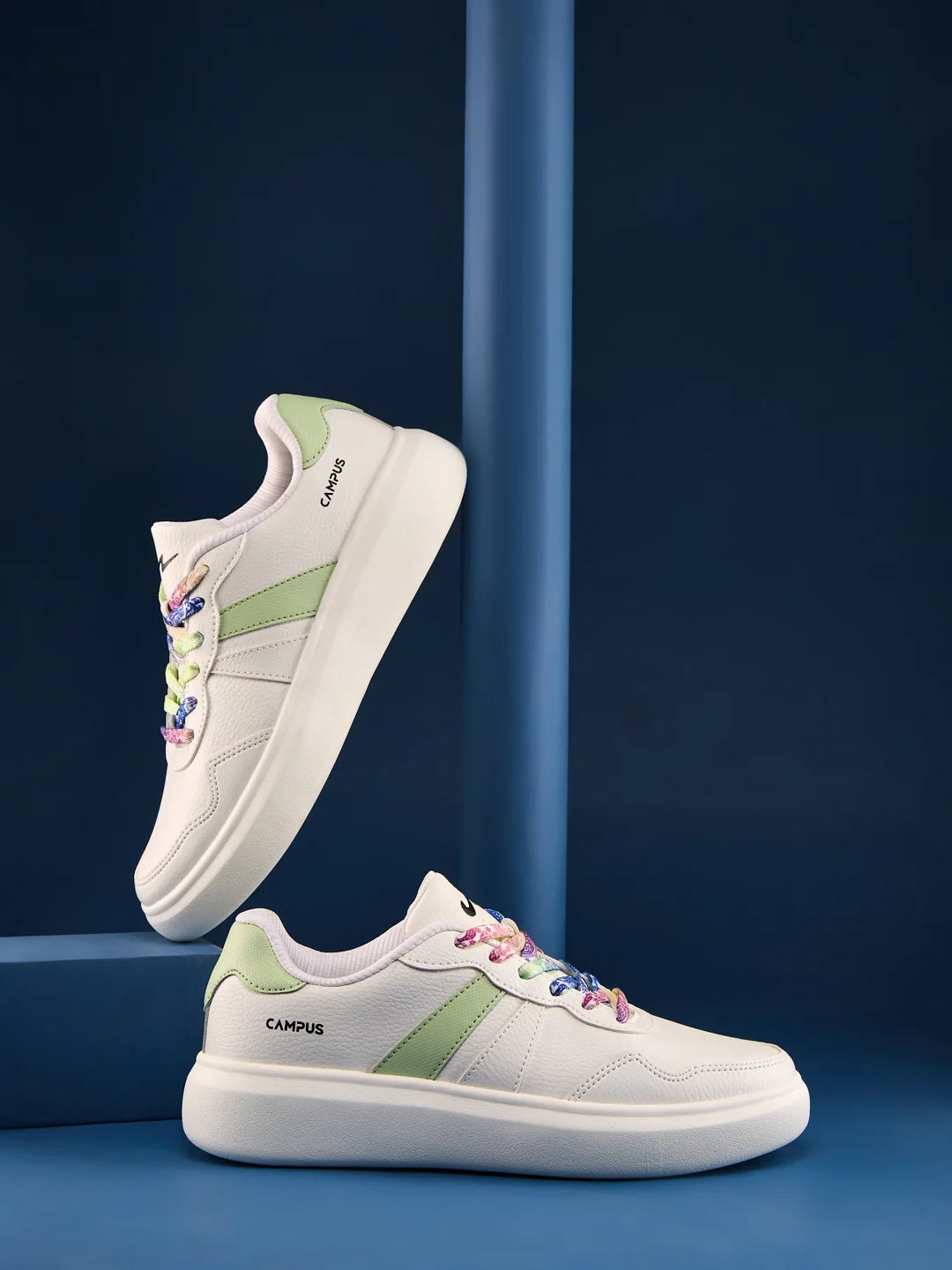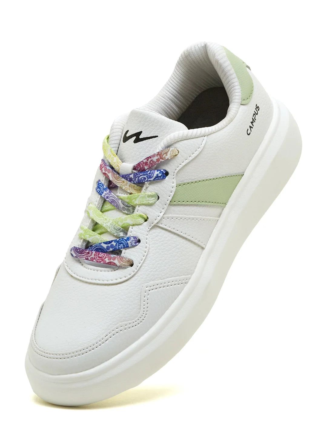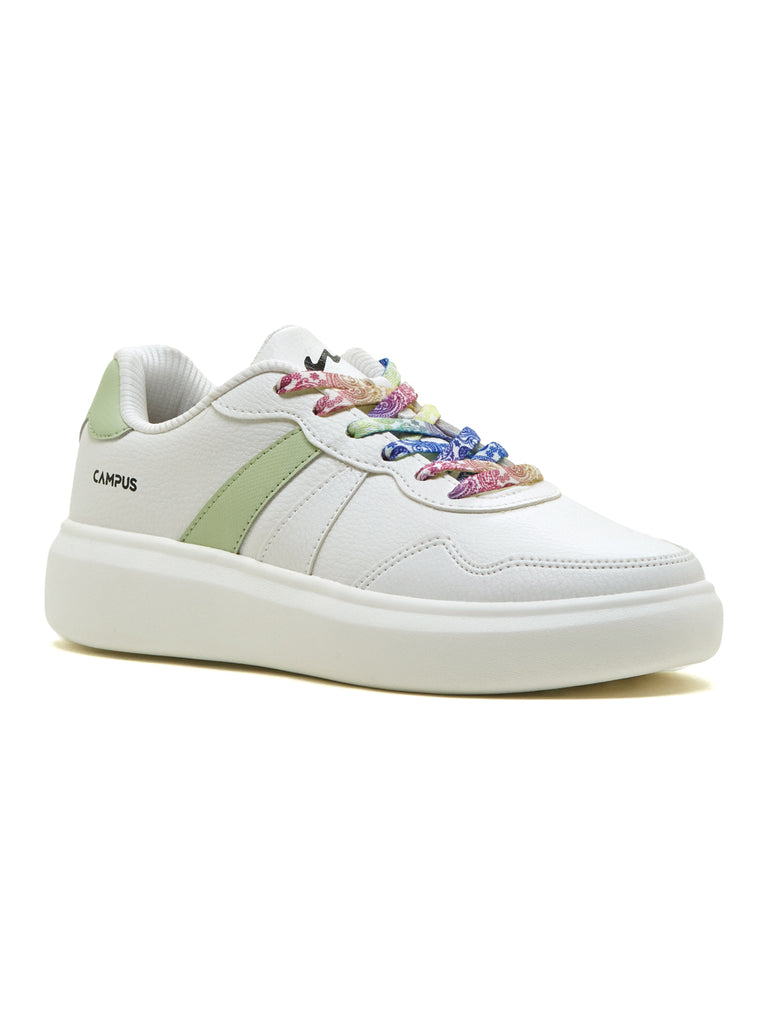 Fun, fresh, and fashion-forward — that’s the vibe of the Campus VALUT Women’s Sneakers in White & Pista Green. The stylish, sleek PVC upper with multicolor laces adds playful charm, while the EVA sole keeps it light and easy to wear all day. Inside, the Memory Foam Insole with Pillofoam cushioning gives you soft, cloud-like comfort. Pair them with shorts, denims, or co-ords — these sneakers are made to keep your style cool and confident with every step.