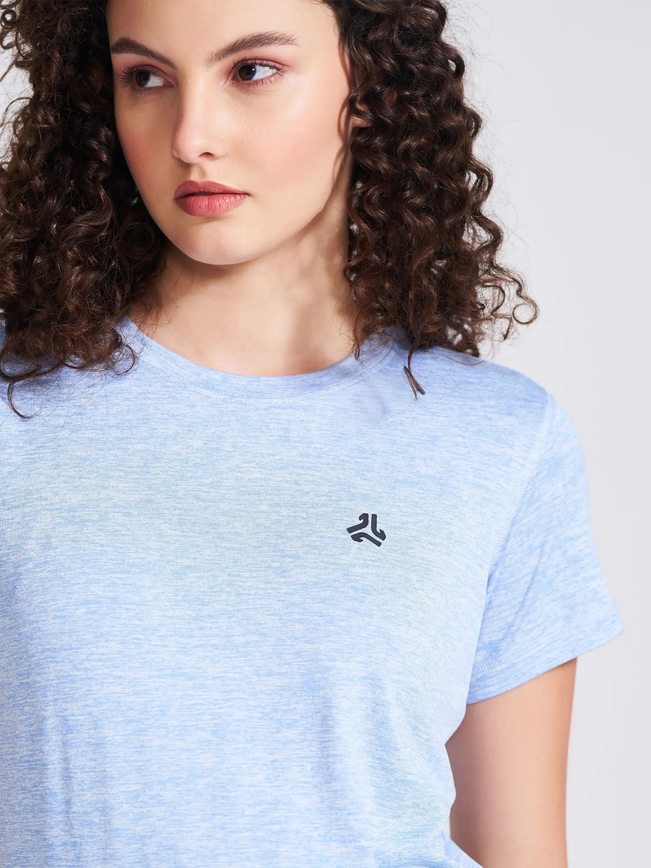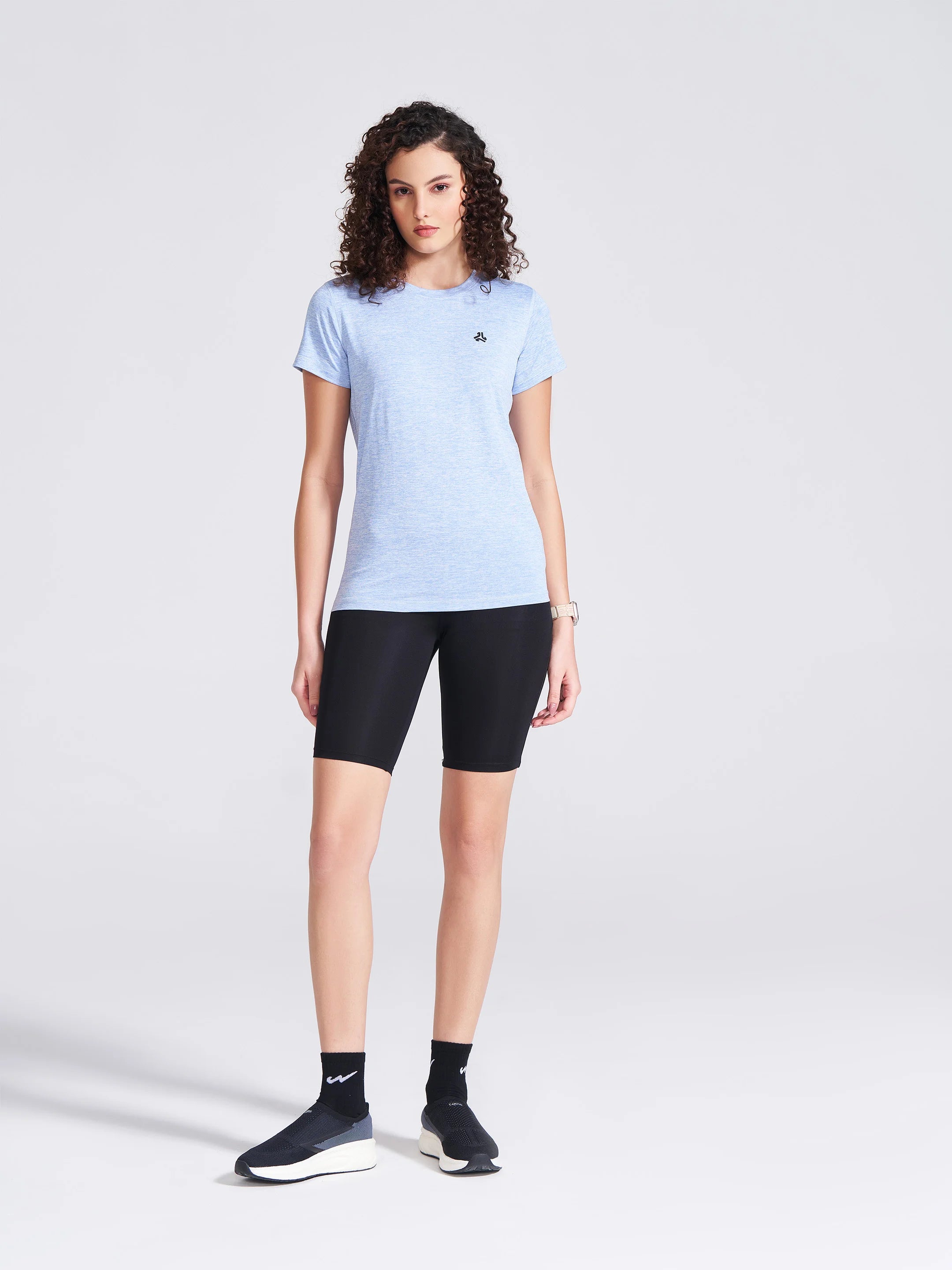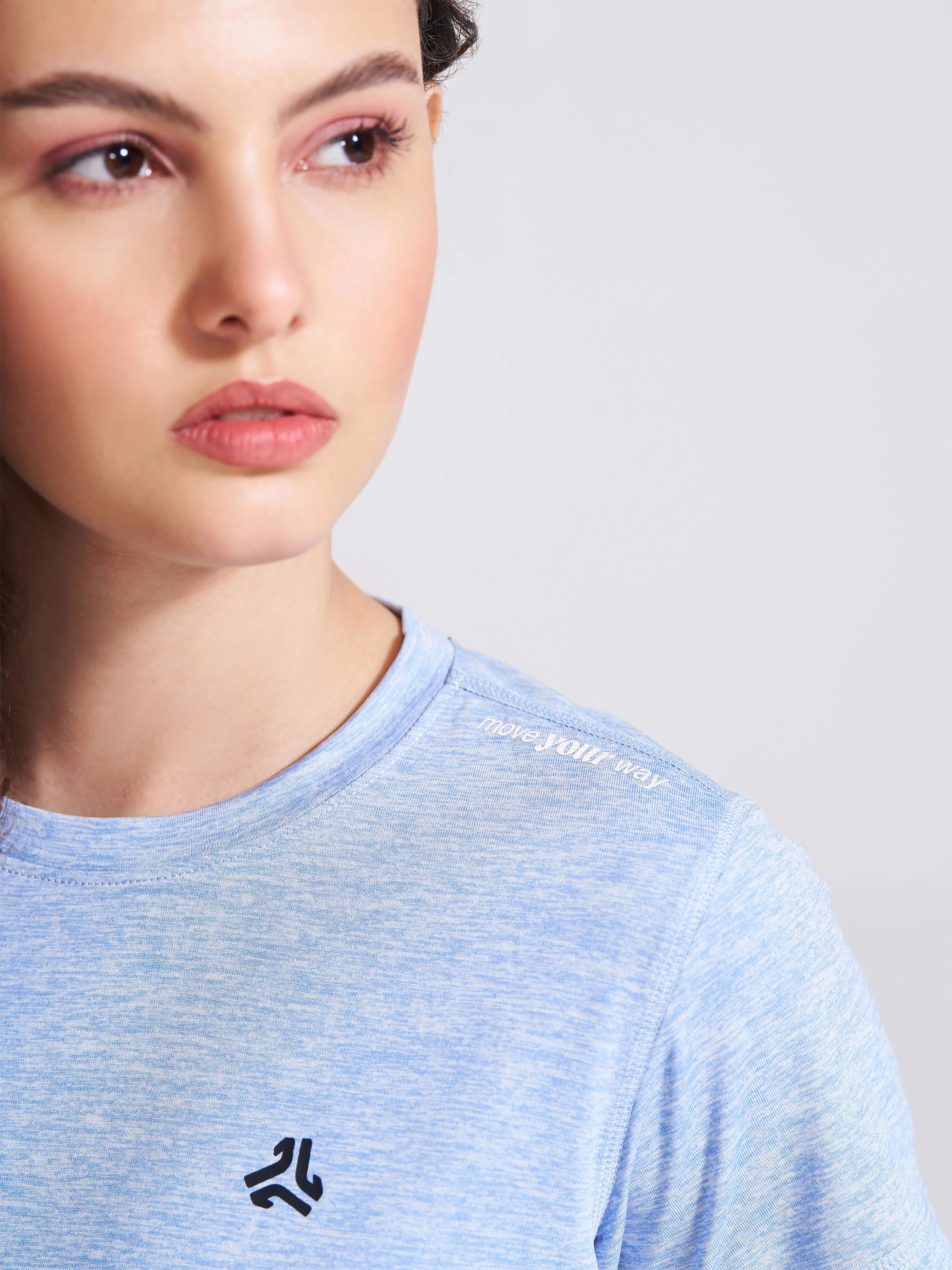 For the days you want a tee that can keep up — this is the one. The Campus Round Neck Dry-Fit T-Shirt comes with a sleek melange texture that makes it look instantly athletic and far from basic. The polyester grindle jersey material feels lightweight and breathable, perfect for quick workouts, long walks, or even those busy, on-the-go mornings. Quick-dry comfort, 2-way stretch, anti-microbial freshness, and an anti-static feel mean you never have to worry about the little stuff. Add in the reflective strip, and you've got a tee that’s built for movement and looks great doing it. The blue shade brings a cool, energetic vibe that works with leggings, joggers, everything!